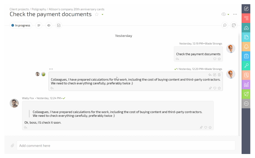 - Збережена історія замовлення (послуги) в одному місці: документи, історія листування, аналітики, інші дії.